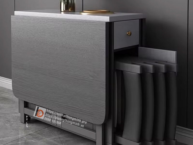 Bàn ăn thông minh có khả năng gấp linh hoạt, sau khi sử dụng xong có thể gấp lại gọn gàng rất phù hợp với diện tích nhà khiêm tốn. Khi gấp lên giống như một chiếc tủ gọn gàng, có thể bày vật dụng trang trí bên trong.