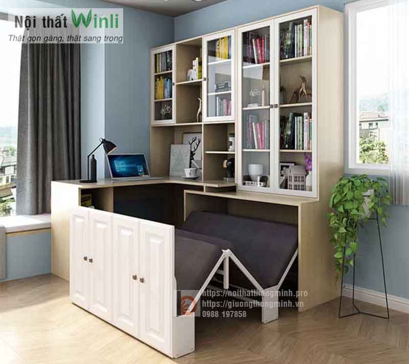 Giường xếp thông minh kết hợp bàn học và tủ sách siêu gọn gàng và tiện lợi cho người sử dụng.